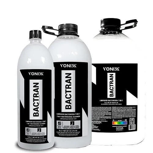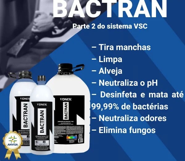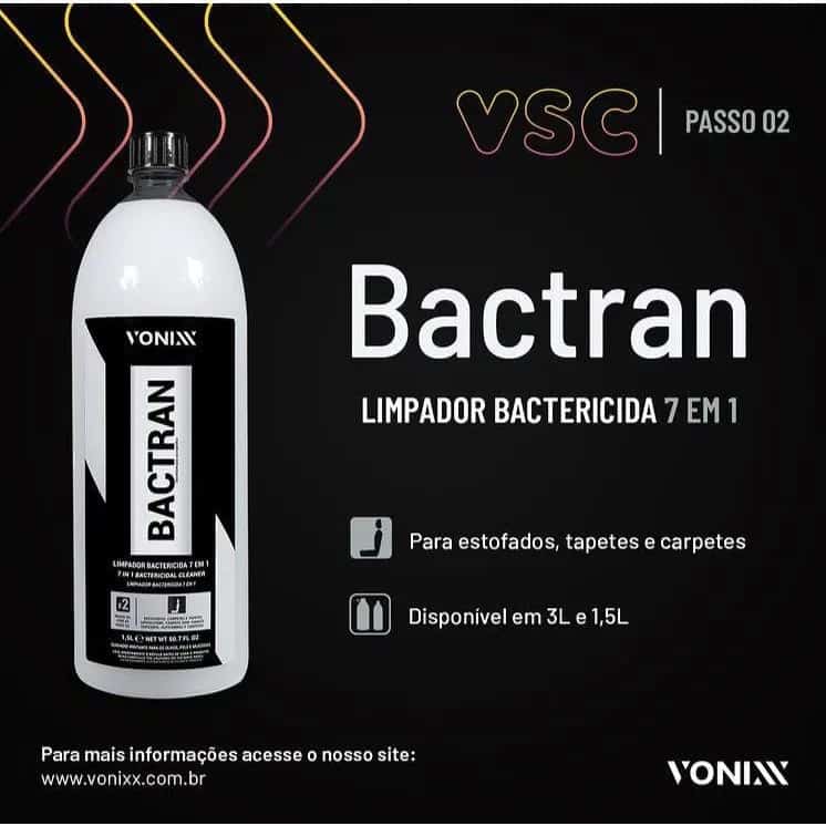 Bactran é um limpador bactericida ultra concentrado da Vonixx, desenvolvido para limpeza profissional de estofados, carpetes e tapetes, prometendo eliminar até 99,9% das bactérias e manchas difíceis.