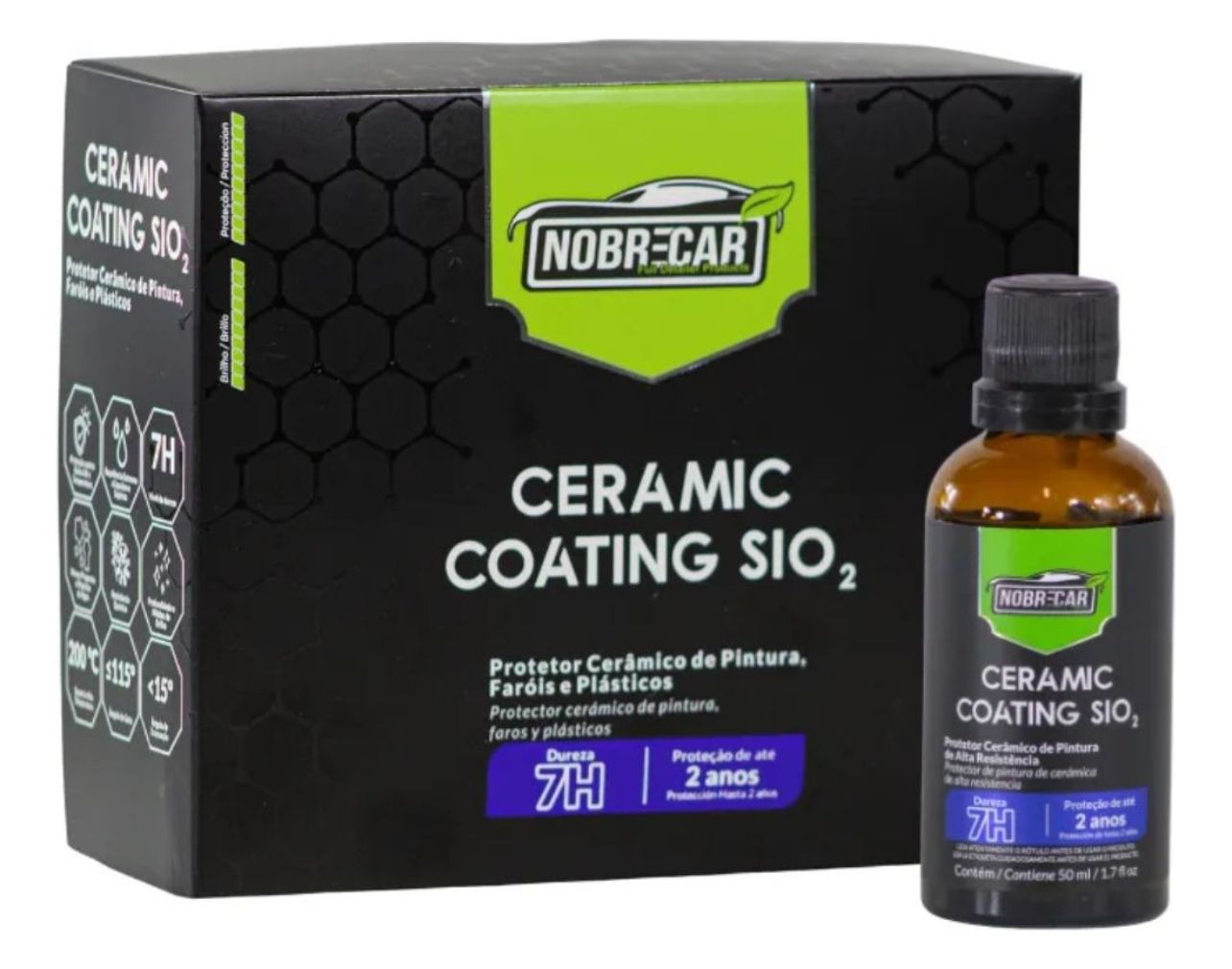 O Nobrecar NC Ceramic Coating 7H 50ml é um vitrificador de pintura de alta performance que oferece brilho intenso, proteção UV e repelência à sujeira com uma durabilidade de até dois anos.