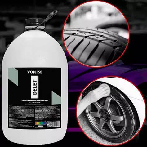 Delet é um limpador de alta performance da marca Vonixx, ideal para remover sujeira pesada em pneus e borrachas, disponível em embalagem de 5L.